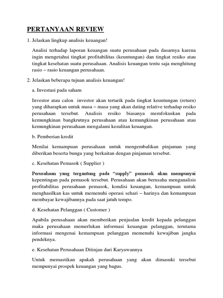 Pertanyaan laporan keuangan. Analisis Laporan Keuangan KR Subramanyam dan John J. Menurut Soemarsono 200434 Laporan keuangan adalah laporan yang dirancang untuk para pembuat keputusan terutama pihak diluar perusahaan mengenai posisi keuangan dan hasil usaha perusahaanLaporan keuangan tidak hanya sebagai alat penguji saja tetapi juga sebagai dasar untuk dapat menentukan atau menilai posisi keuangan perusahaan tersebut di mana dengan hasil. Selain itu laporan keuangan juga berfungsi untuk dilakukannya analisa oleh pihak-pihak yang terkait seperti pemegang saham kreditur dll dalam pengambilan keputusan untuk menentukan perencanaan-perencanaan yang akan.
